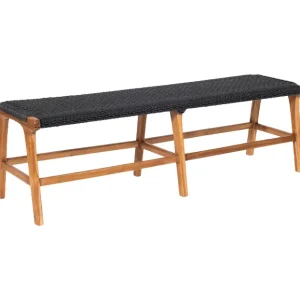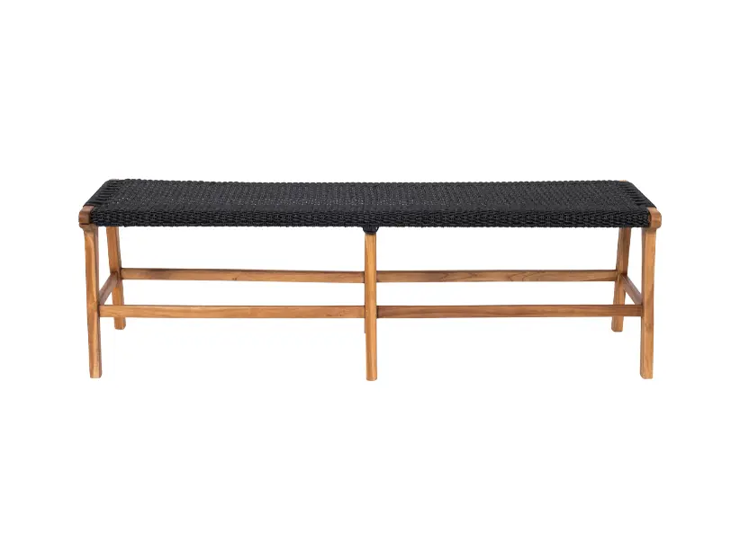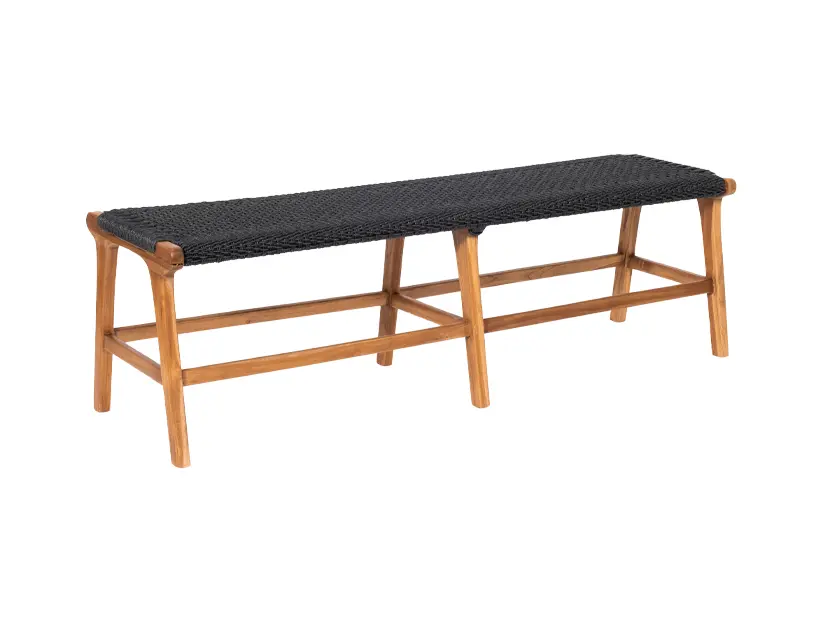 Banca con tejido en color negro en estructura de madera natural, ideal para entornos modernos con un toque rústico elegante.