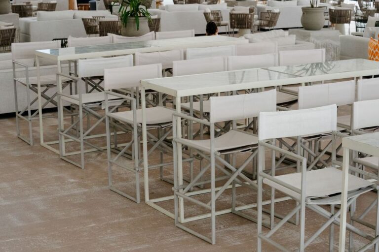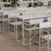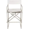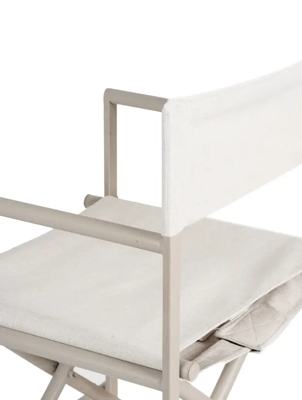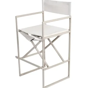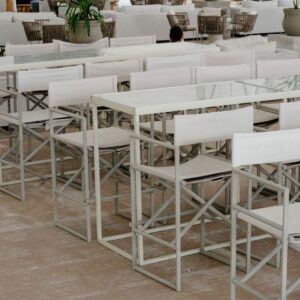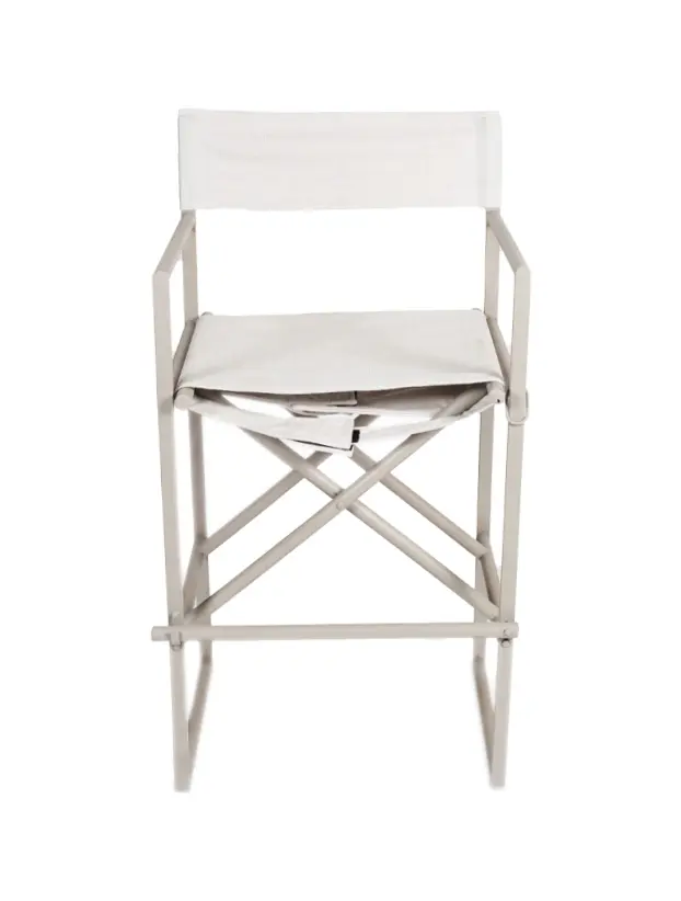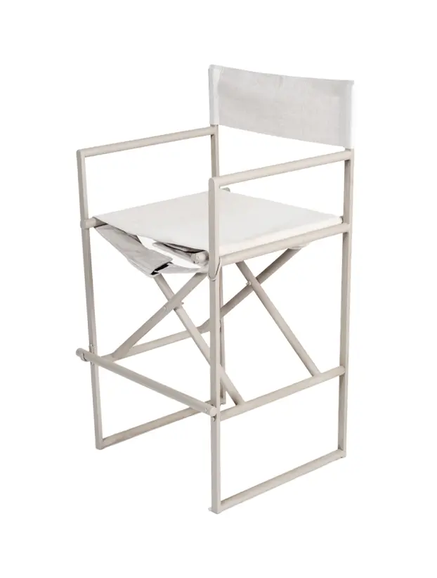 Este es un banco estilo director en un tono claro, ideal para eventos con un enfoque minimalista y moderno. Su estructura está hecha de metal ligero pero resistente, lo que facilita su transporte y montaje. El asiento y el respaldo están elaborados en lona beige, aportando un toque de simplicidad y comodidad. Su diseño alto y lineal lo convierte en una excelente opción para áreas de barra o mesas altas, brindando una estética limpia y contemporánea, perfecta para eventos sofisticados y elegantes.
