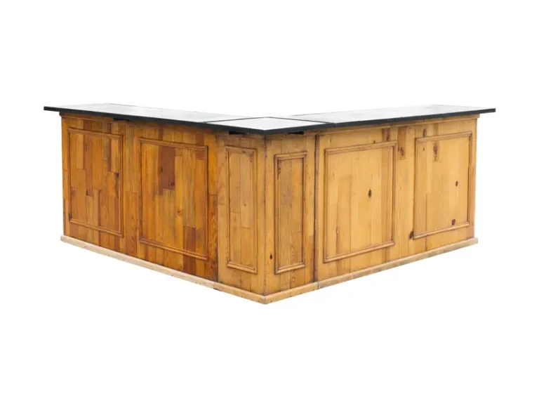 Esta barra estilo rústico está construida en madera con un acabado natural que resalta las vetas y tonalidades cálidas del material. Su diseño en forma de «L» ofrece amplitud y funcionalidad, ideal para su uso en eventos como barra de bebidas o estación de servicio. El detalle de molduras en los paneles añade un toque de elegancia discreta, mientras que la superficie superior, de tono oscuro, contrasta con la madera y proporciona un área resistente para colocar utensilios o elementos decorativos. Este mueble es perfecto para ambientaciones campestres, vintage o de estilo industrial, aportando calidez y un aspecto acogedor al espacio.