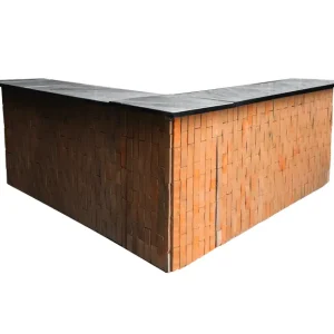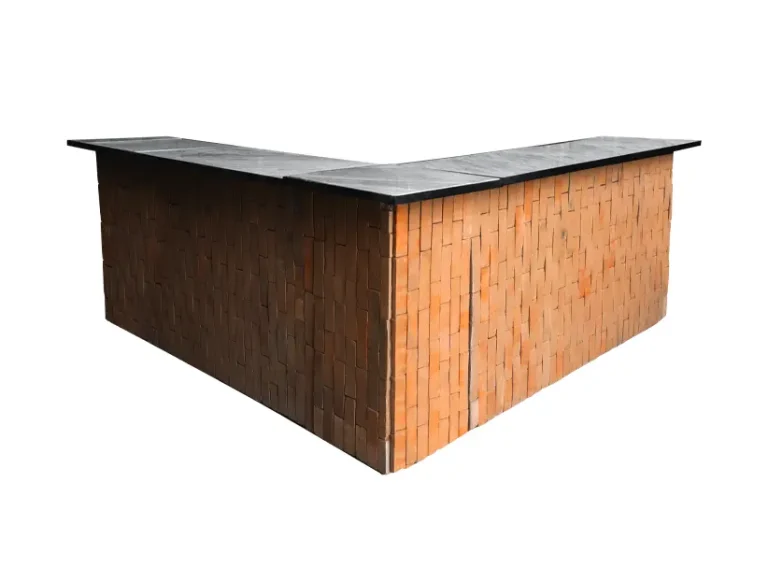Esta barra en forma presenta un diseño rústico inspirado en la arquitectura de ladrillo, con un acabado que resalta las texturas y colores cálidos de este material. La superficie superior oscura proporciona un contraste elegante y funcional, ideal para el servicio en eventos. Su estética artesanal y natural es perfecta para ambientaciones de estilo industrial, campestre o bohemio, aportando calidez y un toque auténtico al espacio. Esta barra es una excelente opción para eventos al aire libre o interiores que buscan un ambiente acogedor y distintivo.