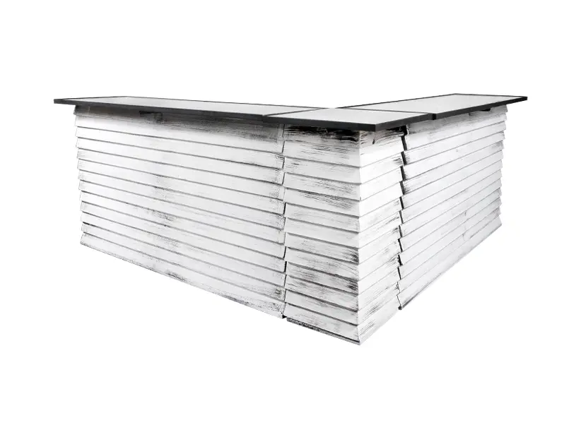 Esta barra tiene un diseño distintivo inspirado en el estilo rústico, con un acabado de listones inclinados en color blanco envejecido que evocan un techo francés antiguo. La superficie superior oscura contrasta de manera elegante con el acabado blanco desgastado, aportando una apariencia vintage y auténtica. Este diseño es ideal para eventos con temáticas campestres, bohemias o chic, añadiendo un elemento decorativo que destaca por su carácter y estilo. La barra no solo es funcional sino que también sirve como pieza decorativa, creando un ambiente acogedor y lleno de personalidad.