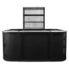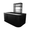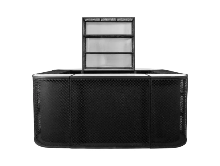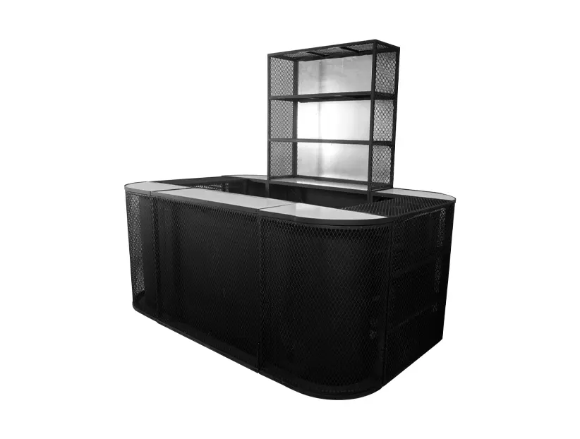 Esta barra de estilo industrial es una opción moderna y versátil para eventos que buscan un ambiente contemporáneo y sofisticado. La estructura está hecha de metal negro con una textura de malla que le da un toque urbano y robusto. La barra incluye estantes en la parte posterior, ideales para almacenamiento de bebidas, copas y utensilios, manteniendo el área organizada y funcional. Su diseño amplio permite que varias personas puedan atender o ser atendidas al mismo tiempo, lo que la convierte en una excelente opción para estaciones de bar en eventos sociales o corporativos. Esta barra es perfecta para ambientar eventos con un estilo moderno, minimalista o industrial.