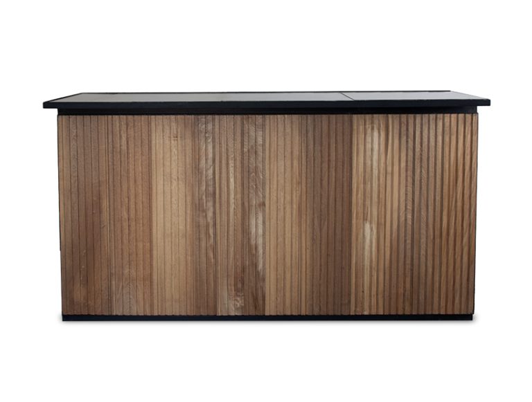 Esta barra de servicio presenta un diseño moderno y natural, ideal para eventos sociales, bodas, cocteles o reuniones corporativas. Su estructura frontal está elaborada en madera con acabado de listones verticales, aportando calidez y textura al ambiente, mientras que su cubierta superior en tono negro añade un contraste elegante y funcional. La barra ofrece una imagen contemporánea y versátil que se adapta a distintos estilos de decoración, siendo perfecta para estaciones de bebidas, barras de café o áreas de recepción. Disponible para renta, es una pieza práctica y estética que eleva la experiencia del evento.
