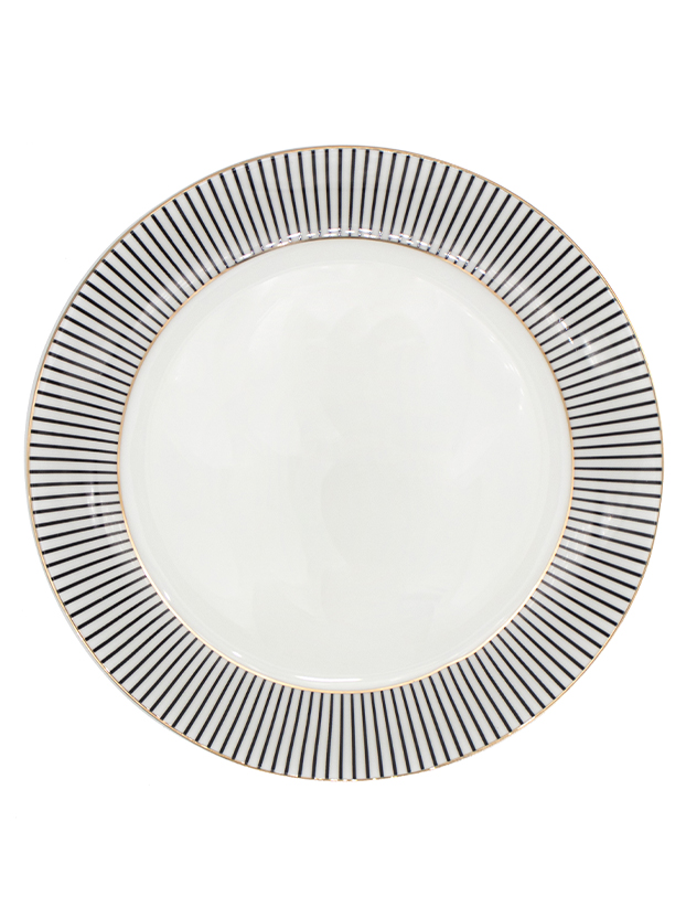 Este elegante plato de porcelana, con borde de líneas negras radiales y sutil contorno dorado, es perfecto para ocasiones especiales. Su diseño sofisticado y centro blanco realzan cualquier presentación de alimentos, ideal para bodas, cenas formales y eventos corporativos, aportando un toque de distinción y modernidad a la mesa.