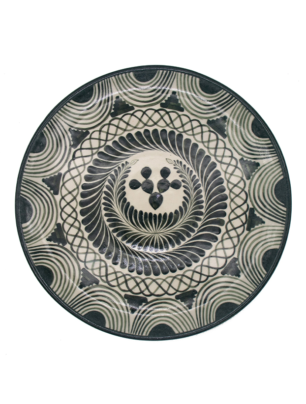Este plato de cerámica presenta un intrincado patrón étnico en tonos negros sobre fondo claro, logrando un estilo llamativo y elegante. Ideal para bodas, eventos temáticos y celebraciones al aire libre, su diseño artesanal aporta un toque cultural y sofisticado, perfecto para mesas con carácter distintivo y decoraciones únicas.