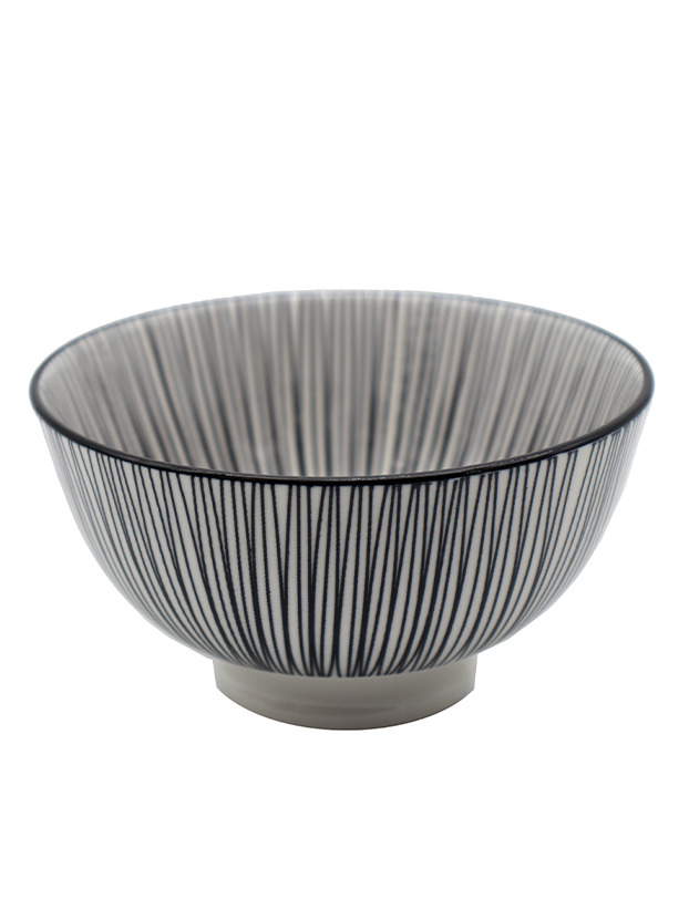 Bowl con diseño minimalista de líneas radiales negras sobre fondo blanco. Su estilo moderno y sofisticado lo convierte en un complemento ideal para mesas contemporáneas. Perfecto para servir alimentos con un diseño que realza la presentación y se adapta a múltiples estilos decorativos.