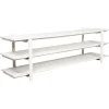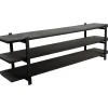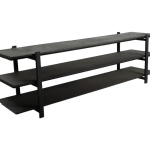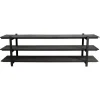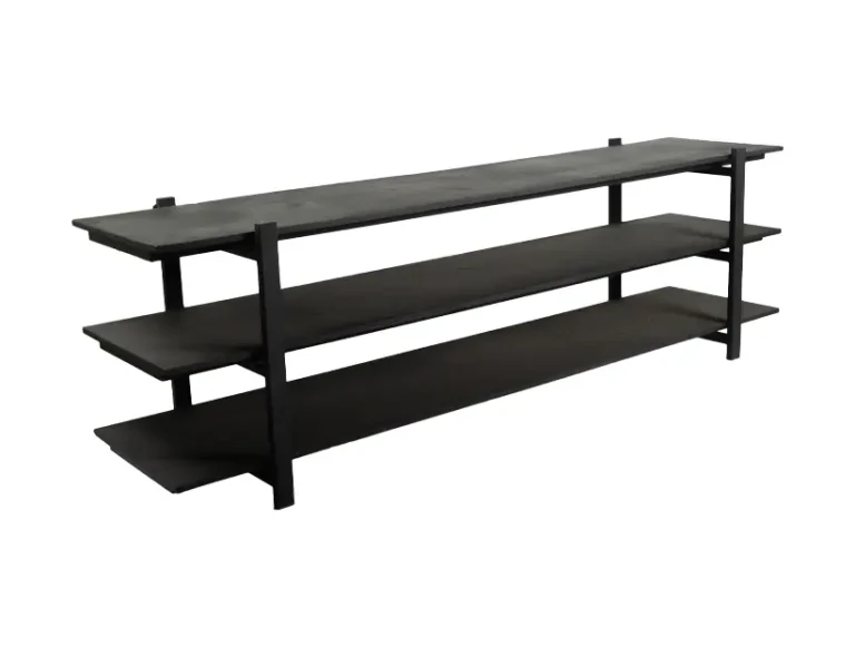 Credenza de tres niveles en color negro, estructura metálica minimalista y estantes amplios y lisos.