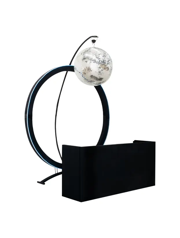 Este DJ booth destaca por su diseño moderno y llamativo, ideal para eventos de estilo disco o futurista. La estructura cuenta con un soporte que sostiene una gran bola de espejos, la cual proyecta destellos de luz y crea un ambiente vibrante y dinámico en el espacio. Un aro iluminado en la parte posterior complementa la estética, añadiendo un efecto visual impactante y atractivo. La base negra del booth proporciona un contraste elegante, enfocando la atención en los elementos decorativos y en la bola de espejos, perfecta para ser el centro de atención en cualquier celebración o fiesta nocturna.