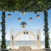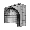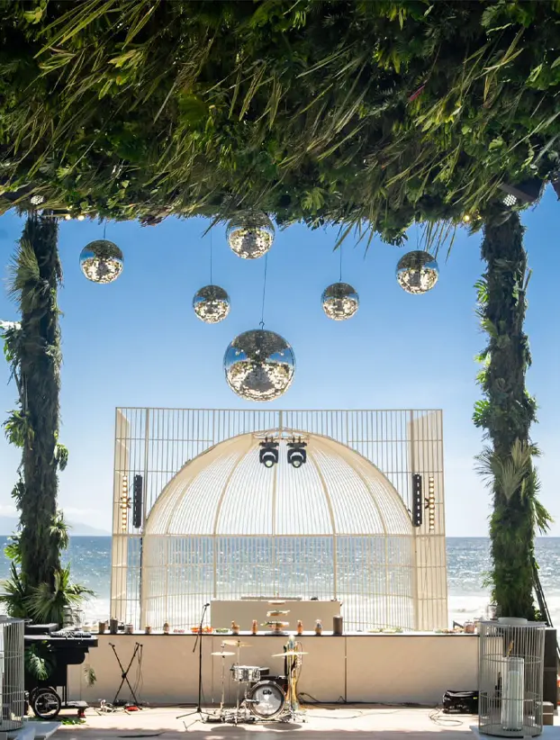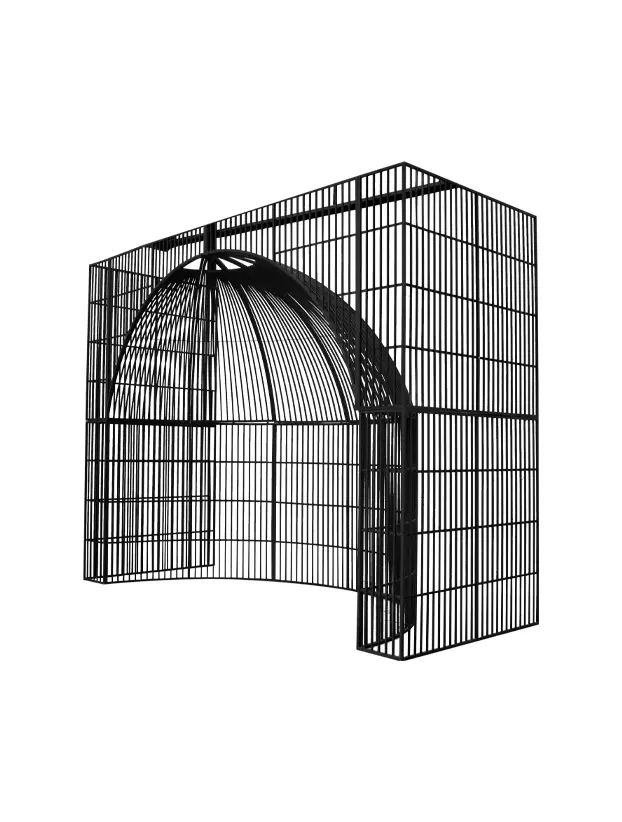 Este DJ booth de estilo industrial y color negro presenta un diseño único en forma de jaula de ave, creando un ambiente audaz y sofisticado para eventos nocturnos o de estilo vanguardista. La estructura metálica está formada por barras verticales que rodean el espacio y le dan un aspecto de jaula, con un arco que añade profundidad y dramatismo al diseño. Este booth no solo destaca por su originalidad, sino que también proporciona una sensación de exclusividad y resguardo para el DJ, convirtiéndolo en un punto focal ideal en ambientes modernos y de alto impacto visual.