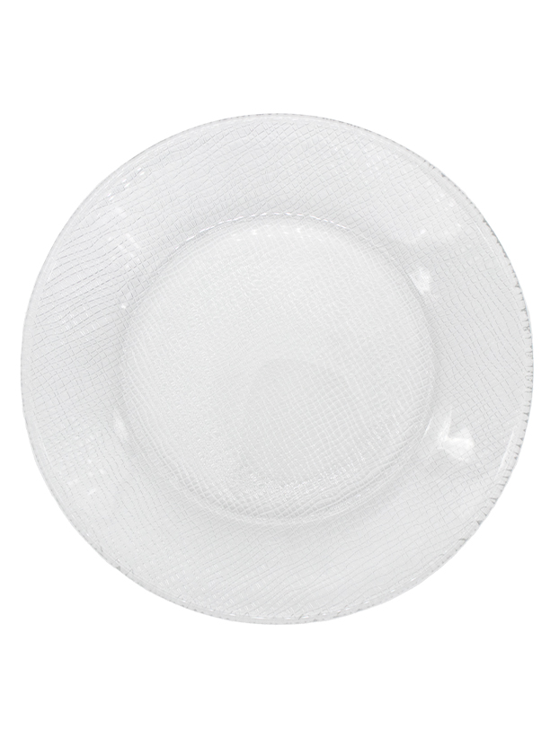 Plato transparente con diseño corrugado que imita un patrón texturizado, ideal para mesas modernas y elegantes. Su estilo versátil resalta los alimentos mientras añade un toque de sofisticación a la decoración. Perfecto para eventos formales o presentaciones creativas que buscan combinar funcionalidad con diseño minimalista y único.