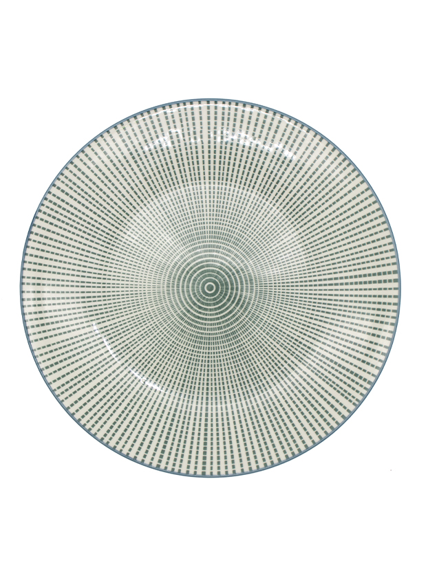Plato con diseño geométrico de líneas concéntricas en tonos verdes, que crea un efecto visual moderno y elegante. Ideal para mesas contemporáneas o temáticas, combina funcionalidad y estilo, destacando cualquier presentación culinaria. Perfecto para eventos o reuniones donde se busque una vajilla que capte la atención y complemente la decoración.
