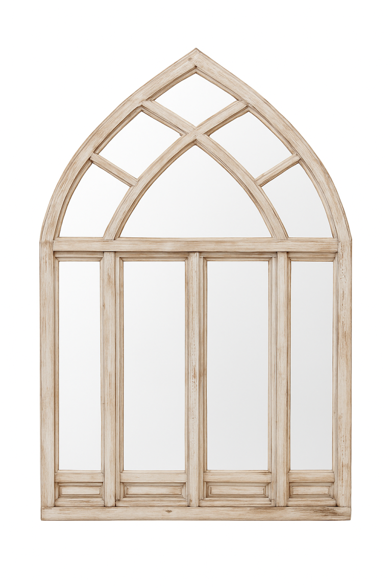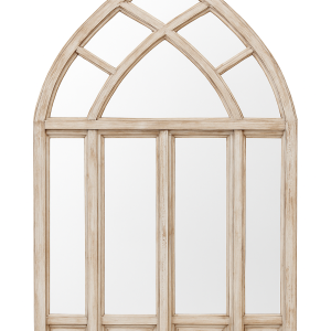 Es un espejo decorativo con marco de madera en acabado envejecido, diseñado con un arco apuntado y divisiones que evocan un ventanal gótico, ideal para aportar un toque arquitectónico clásico o vintage a un espacio interior, ya sea residencial, comercial o en montajes escenográficos.