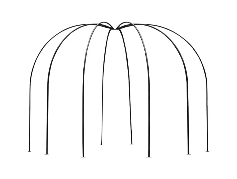 Estructura decorativa tipo araña con 8 arcos en color negro, ideal para renta en eventos que buscan un elemento arquitectónico llamativo y moderno. Esta estructura es perfecta para crear ambientes únicos, ya sea en áreas de lounge, entradas o zonas de fotografía. Su diseño permite decorarla con luces, telas o plantas, adaptándose a diferentes temáticas y estilos de decoración.