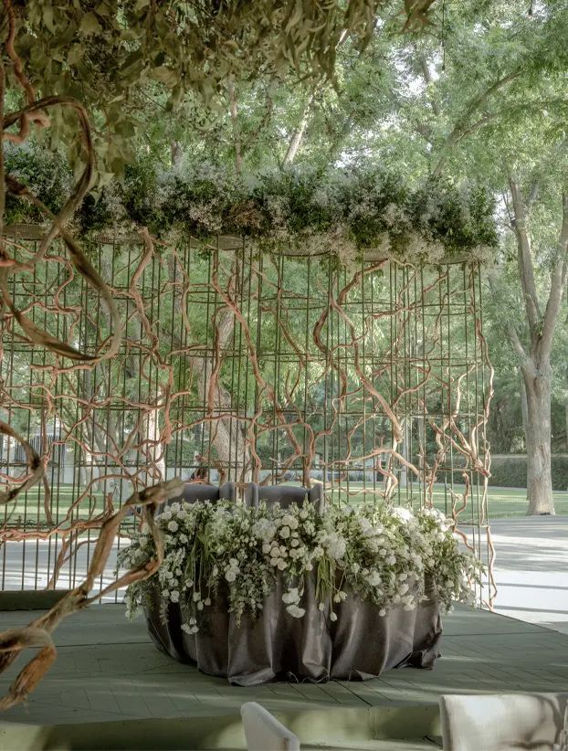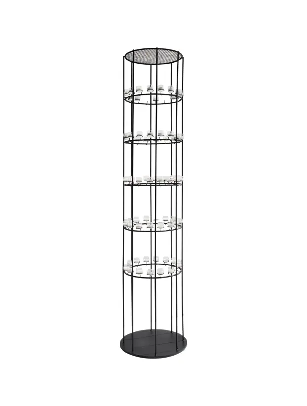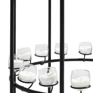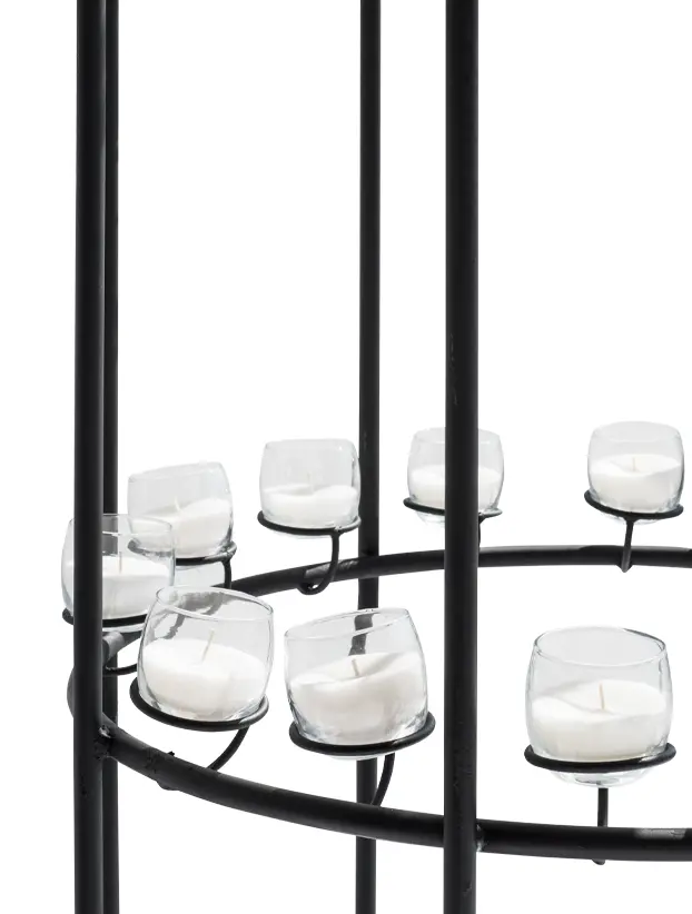 Esta estructura circular de metal en color negro, diseñada para exhibir velas, es una pieza decorativa ideal para crear un ambiente cálido y sofisticado en eventos. Con varios niveles en forma de anillos, ofrece espacio para colocar múltiples velas o pequeños elementos decorativos en cada sección, lo que permite distribuir la luz de manera uniforme y crear un efecto visual impresionante. Su diseño alto y estilizado la convierte en un elemento perfecto para bodas, cenas formales o eventos corporativos, aportando un toque elegante y moderno. La estructura abierta y minimalista permite que esta pieza se integre fácilmente en diferentes estilos decorativos, desde el industrial hasta el contemporáneo.