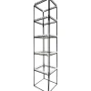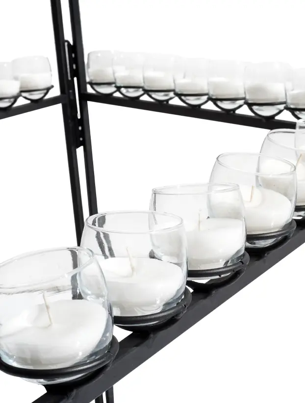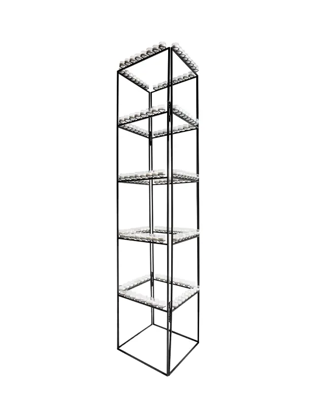Esta estructura en forma de torre con diseño de rombos es una pieza moderna y elegante que aporta un toque distintivo a cualquier evento. Con varias repisas rodeadas de esferas decorativas blancas, es ideal para exhibir velas, plantas pequeñas o elementos decorativos, creando un ambiente iluminado y sofisticado. La estructura metálica en negro añade un contraste elegante con las esferas blancas, logrando una estética contemporánea y minimalista. Perfecta para eventos que buscan un elemento decorativo alto y llamativo, como bodas, recepciones o eventos corporativos, esta pieza puede ser el centro de atención en cualquier espacio, aportando altura y estilo.