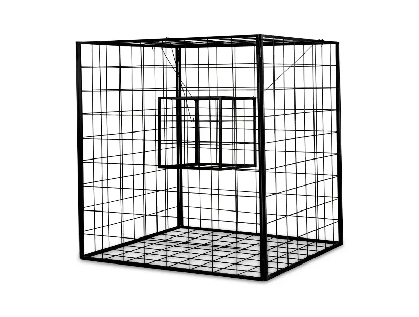 La jaula metalica cubica cuenta con diseño de rejilla negra. Está compuesta por una serie de varillas que forman una cuadrícula uniforme en todas sus caras, lo que le da una apariencia abierta y ligera, similar a una jaula. En el interior, se encuentra una figura cúbica más pequeña suspendida, creando un efecto tridimensional interesante y dinámico. Esta estructura es ideal para decoraciones modernas e industriales, y puede ser utilizada como elemento central en eventos, escaparates o instalaciones artísticas. Se presta para personalizar con luces, plantas colgantes, tejidos o incluso objetos decorativos colocados dentro o alrededor de ella, adaptándose a diferentes temas y estilos. Su diseño geométrico la convierte en un elemento versátil y llamativo.