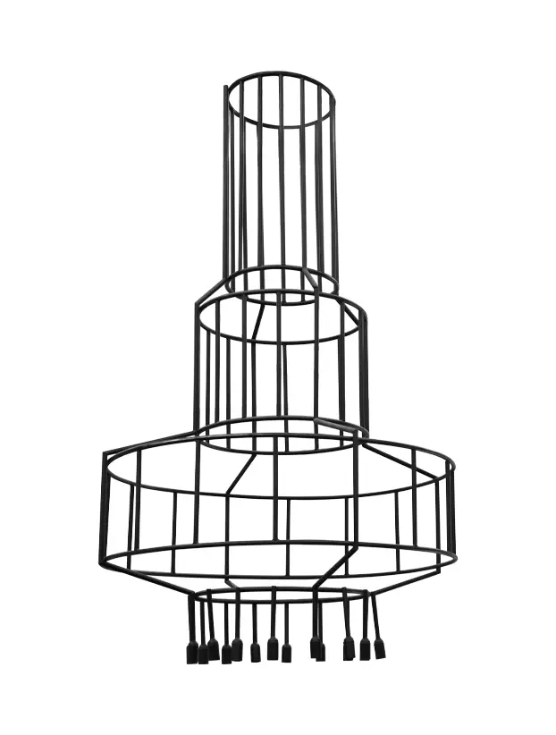 Esta es una estructura de lámpara colgante de gran tamaño en color negro, diseñada con múltiples niveles y un estilo geométrico. Su estructura abierta de líneas verticales y circulares permite que la luz se difunda libremente, generando un efecto visual impresionante, ideal para espacios amplios o techos altos. Este diseño moderno e industrial es perfecto para decoraciones contemporáneas, aportando un toque audaz y sofisticado. Su apariencia arquitectónica la convierte en una pieza llamativa, ideal para eventos que buscan destacar en estilo y elegancia.