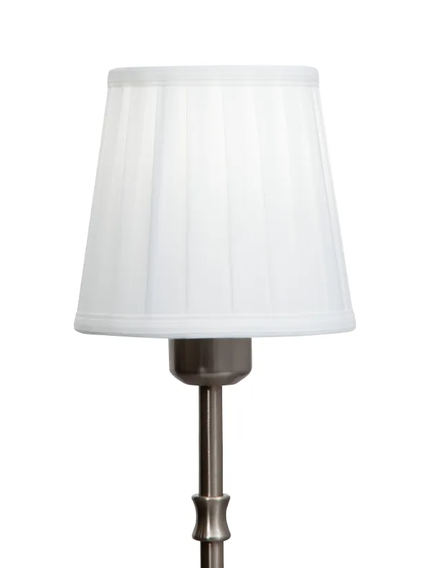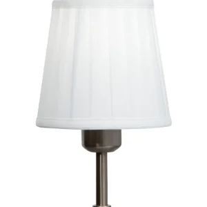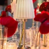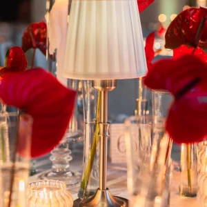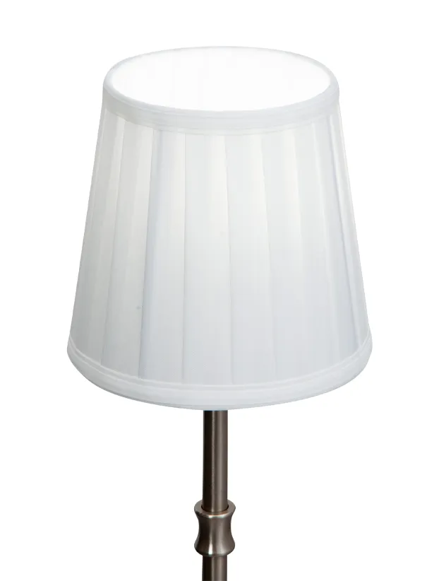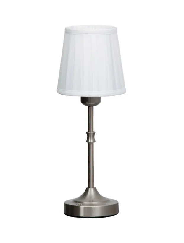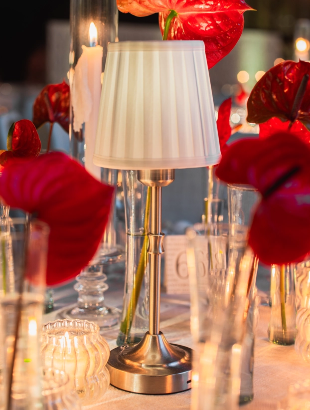 La lámpara biblioteca es un modelo de mesa con un diseño elegante y moderno, ideal para eventos sofisticados. Tiene una base metálica en acabado cepillado, con una estructura delgada y estilizada que sostiene una pantalla plisada en color blanco. Su iluminación cálida crea un ambiente acogedor y resalta los detalles decorativos circundantes. Este tipo de lámpara es perfecta para centros de mesa, aportando un toque refinado a la decoración sin ocupar demasiado espacio visual.