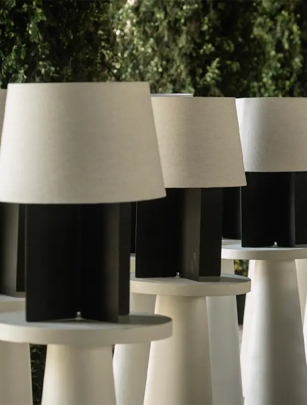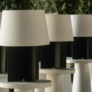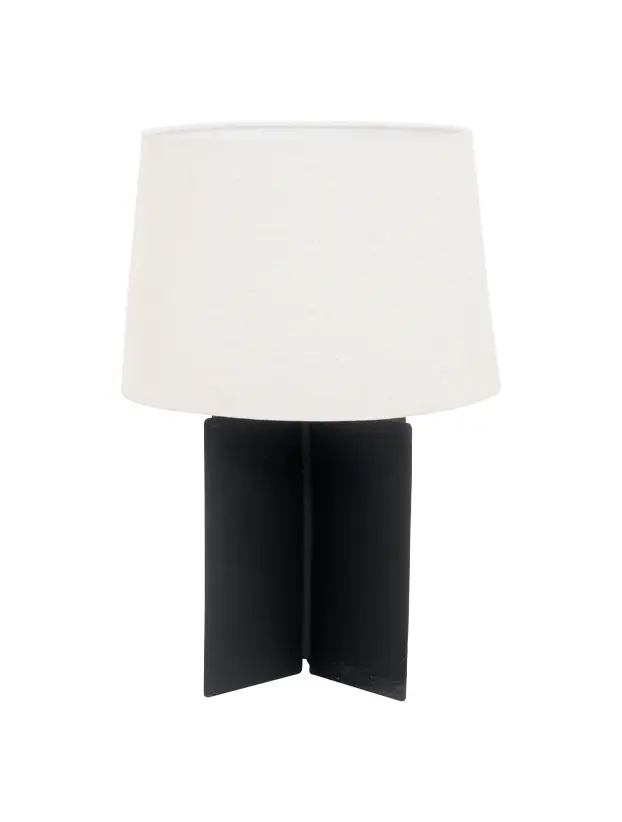 Esta es una lámpara de mesa con un diseño moderno y minimalista, caracterizada por su base en forma de cruz en color negro y su pantalla en tono claro. La base en cruz le da estabilidad y un toque distintivo que contrasta elegantemente con la simplicidad de la pantalla. Esta combinación de colores neutros hace que la lámpara sea fácil de integrar en cualquier espacio, brindando una iluminación suave y acogedora. Es ideal para mesas auxiliares o de noche, añadiendo un toque contemporáneo y sofisticado al ambiente.