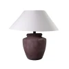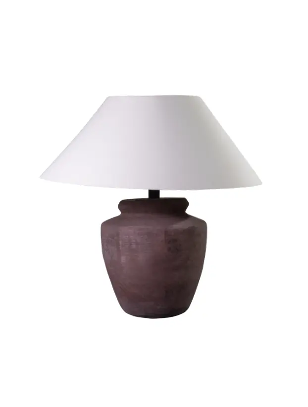 Esta es una lámpara de mesa con base de barro en un tono terracota oscuro y pantalla blanca, ideal para añadir un toque rústico y elegante a cualquier espacio. La base de barro le da un carácter artesanal y natural, mientras que la pantalla cónica blanca distribuye la luz de manera suave y acogedora, creando un ambiente cálido. Este diseño versátil se adapta bien a decoraciones tanto contemporáneas como tradicionales, siendo perfecta para mesas auxiliares o de noche en eventos o en el hogar.