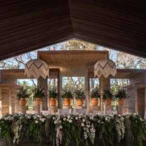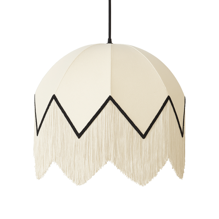 Esta lámpara colgante para renta tiene un diseño vintage inspirado en estilos clásicos. Su estructura tiene una forma curvilínea y elegante, con un exterior en tela color ivory adornada con bordes negros que destacan su silueta. La parte inferior está decorada con flecos largos que añaden movimiento y un toque retro. Es perfecta para eventos temáticos, bodas, o recepciones que busquen un ambiente nostálgico y sofisticado.