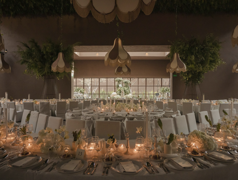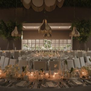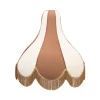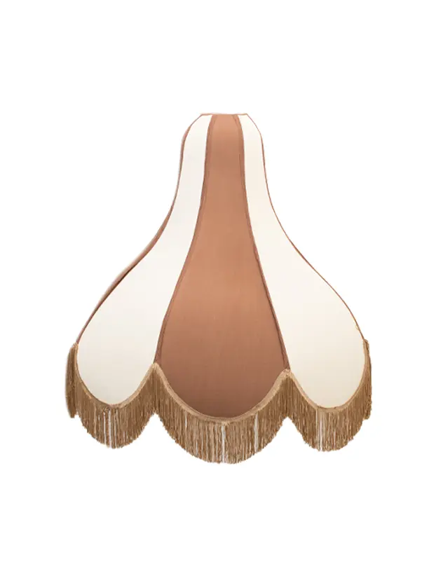 Esta lámpara colgante para renta tiene un diseño vintage inspirado en estilos clásicos. Su estructura tiene una forma curvilínea y elegante, con un exterior en tela color ivory adornada con bordes en color beige que destacan su silueta. La parte inferior está decorada con flecos largos que añaden movimiento y un toque retro. Es perfecta para eventos temáticos, bodas, o recepciones que busquen un ambiente nostálgico y sofisticado.