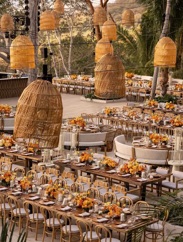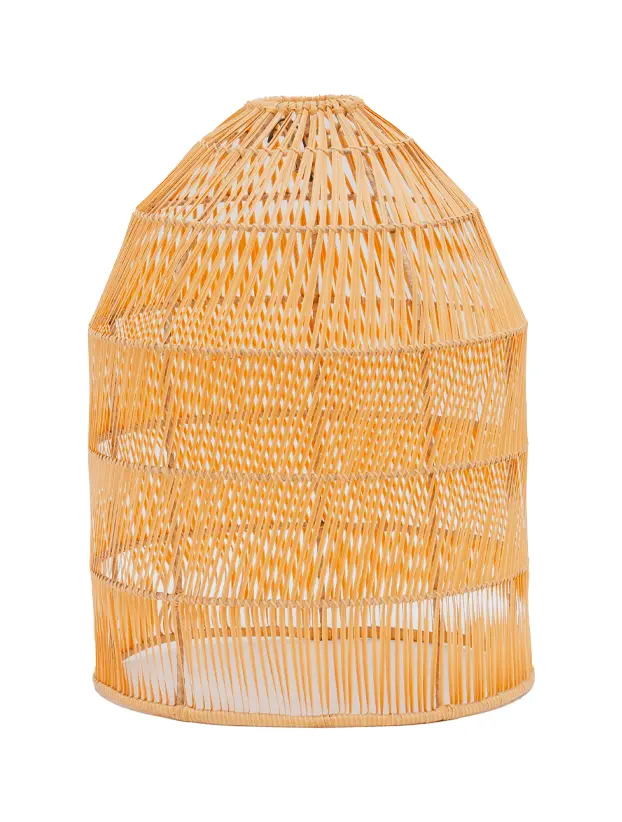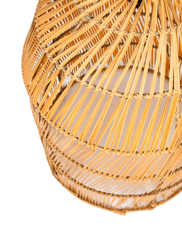 Esta es una lámpara de mimbre tejida en forma de cúpula alargada, ideal para añadir un toque bohemio y natural a cualquier espacio. Su diseño ligero y abierto permite que la luz se filtre suavemente, creando patrones de sombras interesantes y acogedores. El color cálido del mimbre aporta una sensación rústica y orgánica, haciéndola perfecta para eventos al aire libre o decoraciones interiores con un estilo tropical o relajado. Esta lámpara es una excelente opción para crear ambientes cálidos y acogedores.