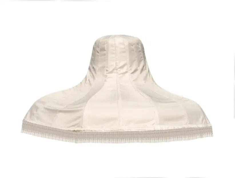Con un diseño elegante y sofisticado, esta lámpara presenta una estructura amplia en forma de cúpula elaborada en tela satinada de color ivory, lo que le da un acabado lujoso y refinado. Su contorno está decorado con un delicado fleco que aporta un toque vintage y distintivo, ideal para ambientaciones clásicas o temáticas de época. Gracias a su tamaño y forma envolvente, es perfecta para generar una iluminación cálida y difusa, realzando la atmósfera de cualquier evento especial como bodas, cenas de gala o recepciones elegantes.