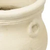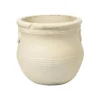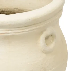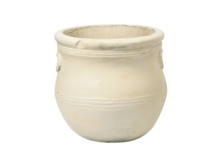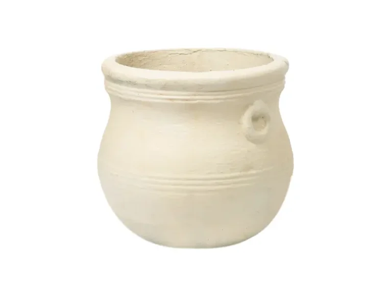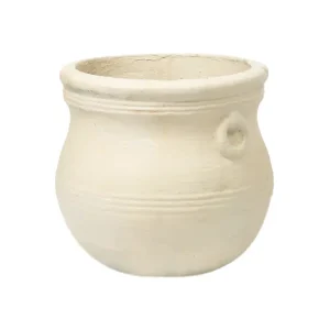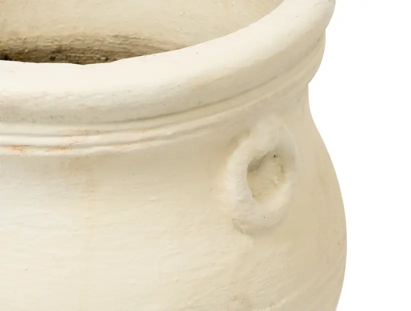 Esta maceta de barro presenta un diseño tradicional en color claro, con un acabado mate y detalles de líneas horizontales en relieve que le aportan textura. Su forma ancha y redondeada, con asas decorativas en los laterales, le da un aspecto rústico y artesanal, ideal para ambientaciones naturales o bohemias. Es perfecta para su uso en eventos como contenedor de plantas o arreglos florales grandes, aportando un toque auténtico y decorativo que complementa diversos estilos decorativos en espacios interiores o exteriores.