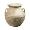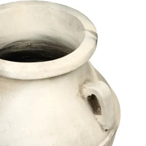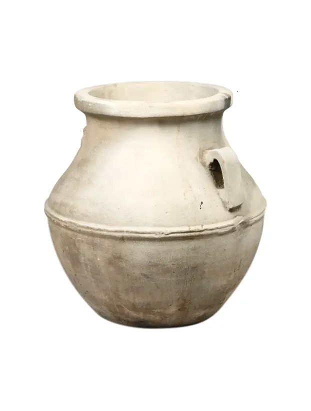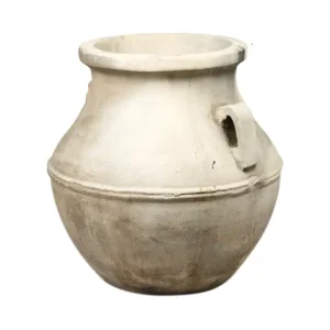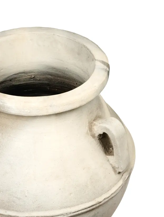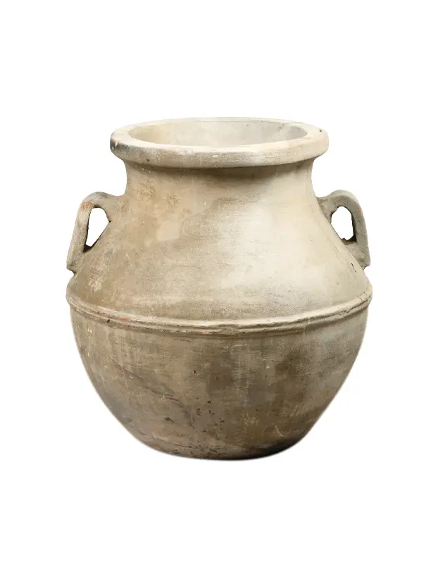 Esta maceta de barro tiene un diseño robusto y tradicional, con un acabado mate en tono gris que le aporta un aspecto rústico y elegante. Su forma amplia y redondeada se complementa con un cuello ligeramente estrecho y dos asas laterales, lo que añade un toque funcional y decorativo. Un detalle de línea horizontal en relieve divide la pieza y le aporta textura visual. Esta maceta es ideal para decoraciones de estilo bohemio, industrial o vintage, perfecta para contener plantas o arreglos florales grandes, destacando en eventos por su presencia y autenticidad.