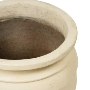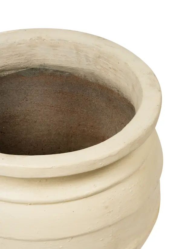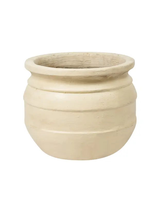 Esta maceta de barro blanca tiene un diseño clásico con un acabado mate y líneas horizontales en relieve que le aportan textura y carácter. Su forma redondeada y robusta es ideal para contener plantas o arreglos florales de tamaño mediano a grande, y su color neutro permite integrarla en una variedad de estilos decorativos, desde minimalista hasta rústico o bohemio. Esta maceta es perfecta para agregar un toque natural y elegante en eventos, ofreciendo una base versátil para decorar cualquier espacio con un estilo limpio y sofisticado.