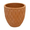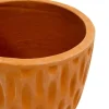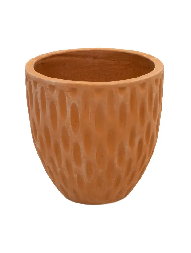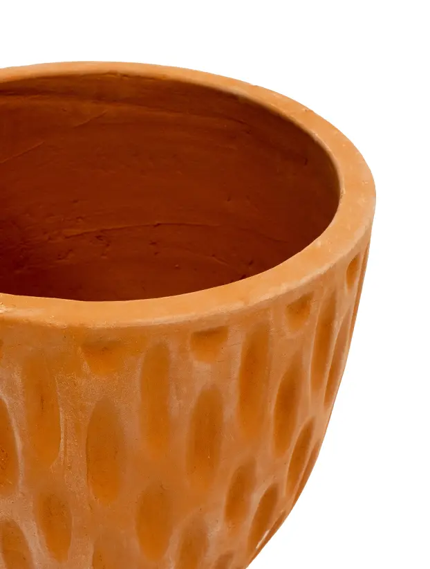 Esta maceta de barro en tono terracota destaca por su diseño texturizado con relieves geométricos, aportando un toque rústico y sofisticado a cualquier evento. Su acabado artesanal y su forma versátil la hacen ideal para complementar decoraciones con plantas naturales o arreglos florales, realzando el ambiente con su estilo orgánico y elegante.