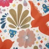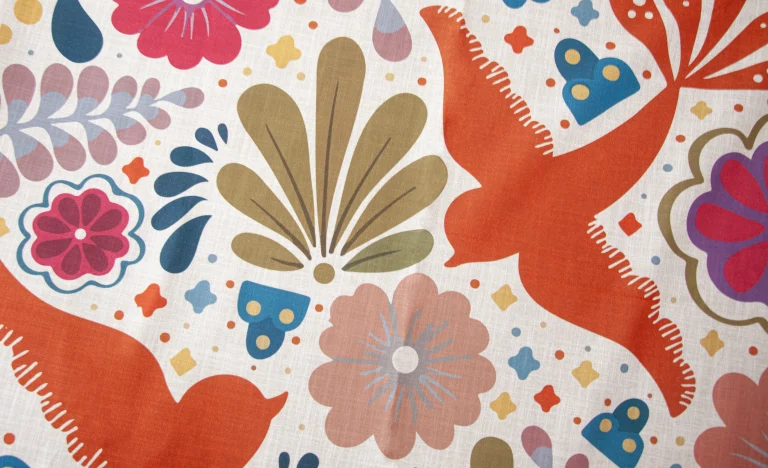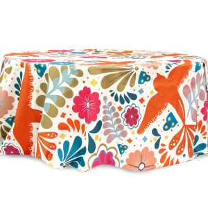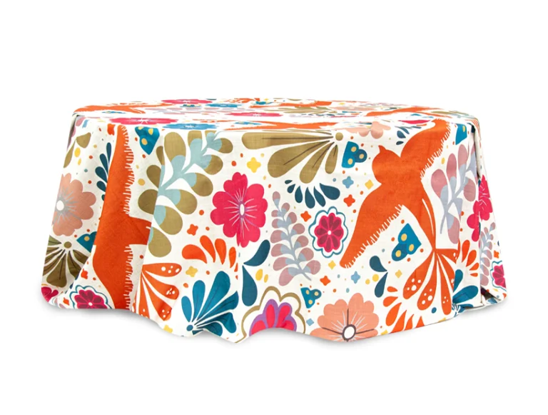 Mantel con estampado colorido de inspiración folclórica, decorado con aves en tonos naranjas y una mezcla vibrante de flores y figuras geométricas en colores vivos como rosa, azul, dorado y verde. Su diseño alegre y artesanal lo convierte en una pieza ideal para celebraciones temáticas, eventos culturales o fiestas que buscan transmitir calidez, tradición y un ambiente festivo lleno de vida.