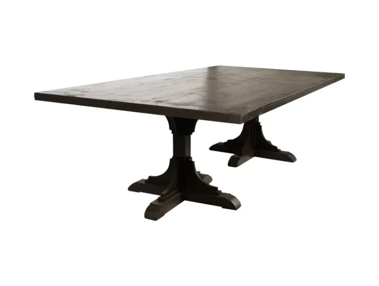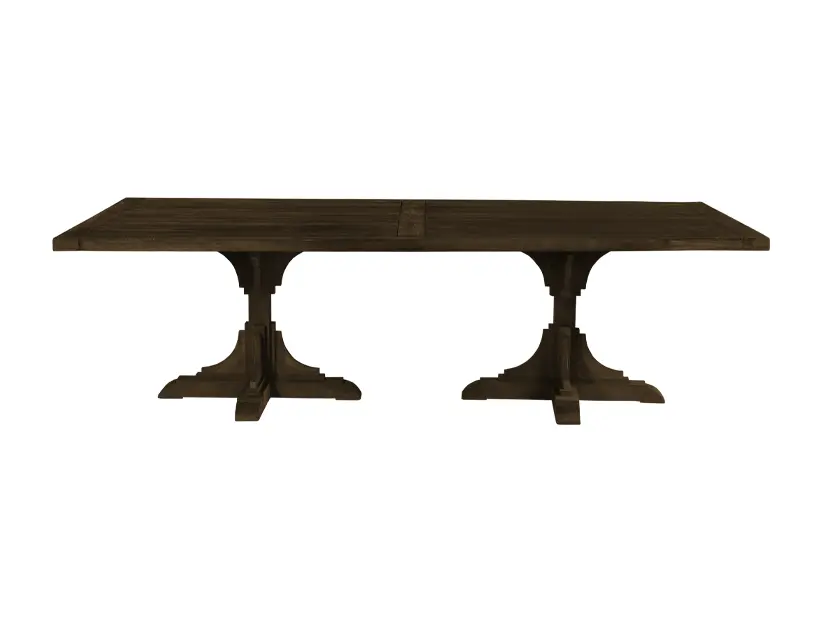 Esta mesa de madera en tono nogal oscuro tiene un diseño clásico y robusto, inspirado en el estilo del siglo XX. Su base con soportes dobles tallados le da un aspecto elegante y atemporal, ideal para ambientes formales o rústicos. La estructura sólida y el acabado en nogal americano aportan calidez y sofisticación, haciéndola perfecta para eventos que buscan un toque de distinción y carácter en la decoración.