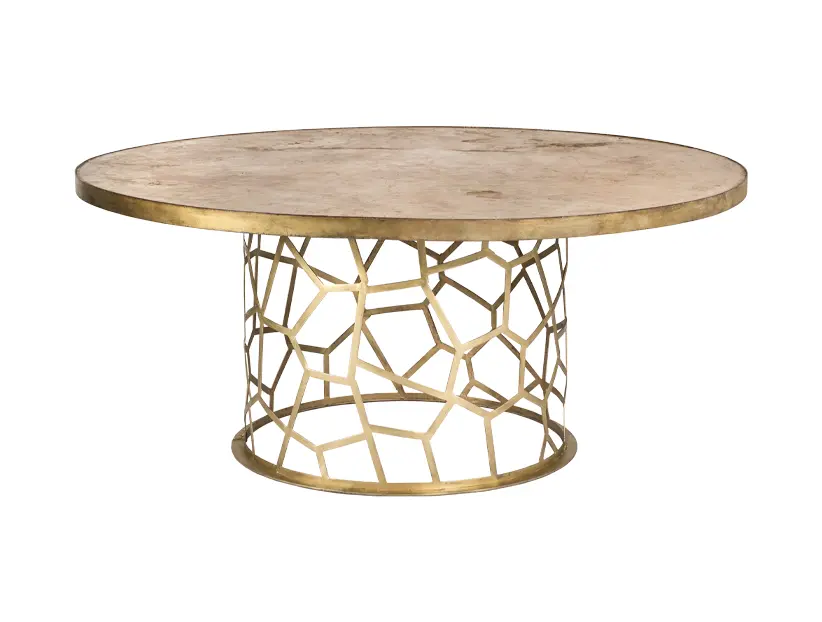 Esta mesa redonda de estilo vintage combina elegancia y diseño moderno con su base dorada de patrón geométrico abierto. La estructura metálica en dorado crea un efecto visual atractivo y sofisticado, mientras que el tablero en tono claro aporta un toque de equilibrio y serenidad. Ideal para eventos que buscan una pieza central llamativa, esta mesa es perfecta para decoraciones de estilo glamuroso o contemporáneo, añadiendo un aire de lujo y distinción al espacio.