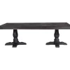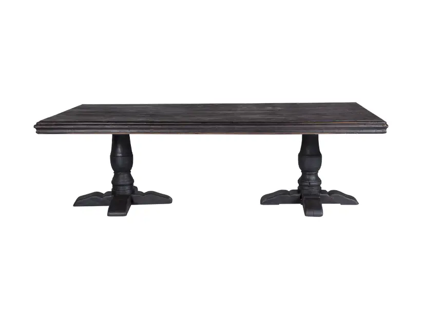 Esta mesa de madera en color negro combina un diseño robusto con un toque clásico. Su base de doble pedestal tallado le aporta estabilidad y un estilo elegante que recuerda a los muebles tradicionales. El acabado oscuro le da un aspecto sofisticado, ideal para eventos formales o espacios que buscan una decoración con carácter y presencia. Es una elección perfecta para banquetes o reuniones que requieren una mesa amplia y con personalidad distintiva.