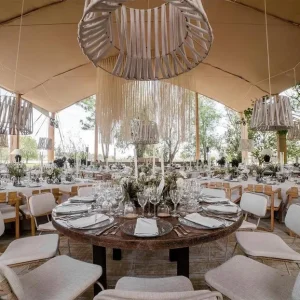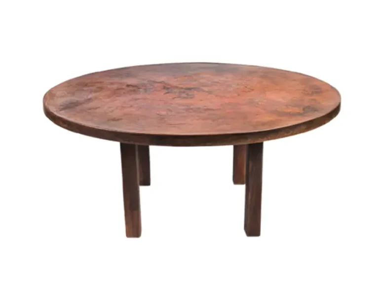 Esta mesa redonda tiene un acabado en cobre que le da un aspecto rústico y artesanal, ideal para ambientes cálidos y auténticos. La superficie texturizada y tonalidad rojiza añaden un toque de calidez y originalidad, mientras que sus patas de madera robustas aseguran estabilidad y durabilidad. Es una excelente opción para eventos o decoraciones que buscan un estilo natural y tradicional, aportando un elemento visual atractivo y único al espacio.