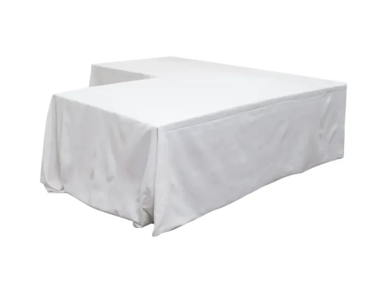 Esta mesa en forma de «L» está cubierta con un mantel blanco que le da una apariencia limpia y elegante, ideal para eventos formales como bodas, conferencias o recepciones. El mantel cae suavemente hasta el suelo, cubriendo por completo las patas de la mesa y proporcionando un aspecto uniforme y sofisticado. La configuración en «L» es funcional, permitiendo un mejor aprovechamiento del espacio para el servicio de alimentos, bebidas o material de exposición. Este estilo de mesa es versátil y se adapta a diversas decoraciones, aportando una base neutra y profesional para diferentes tipos de eventos.