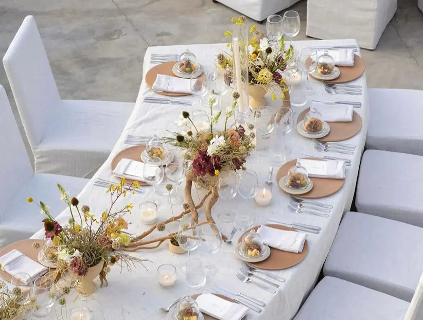 Esta es una mesa curva cubierta con un mantel en tono marfil, ideal para eventos formales y elegantes. Su forma curva permite una disposición dinámica, perfecta para estaciones de servicio, bufés o áreas de exhibición en eventos sociales o corporativos. El mantel marfil cae suavemente hasta el suelo, proporcionando un aspecto limpio y sofisticado que se adapta bien a una variedad de decoraciones. Esta mesa es excelente para espacios que buscan un toque de distinción y funcionalidad en su disposición.