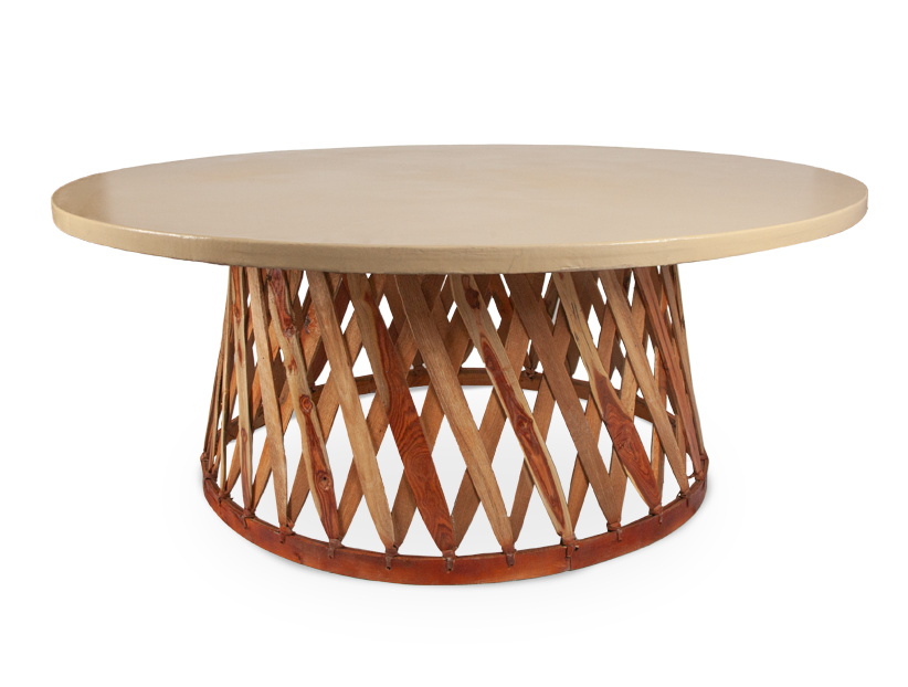 Mesa redonda de diseño elegante y natural, ideal para renta en eventos sociales y corporativos, con cubierta lisa en tono beige que aporta sobriedad y armonía al espacio; su base de madera con entramado decorativo brinda un estilo artesanal y contemporáneo, además de ofrecer firmeza y estabilidad, convirtiéndola en una pieza versátil y sofisticada para bodas, eventos empresariales, áreas lounge y montajes de estilo orgánico o boho.
