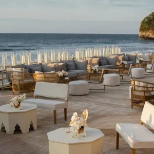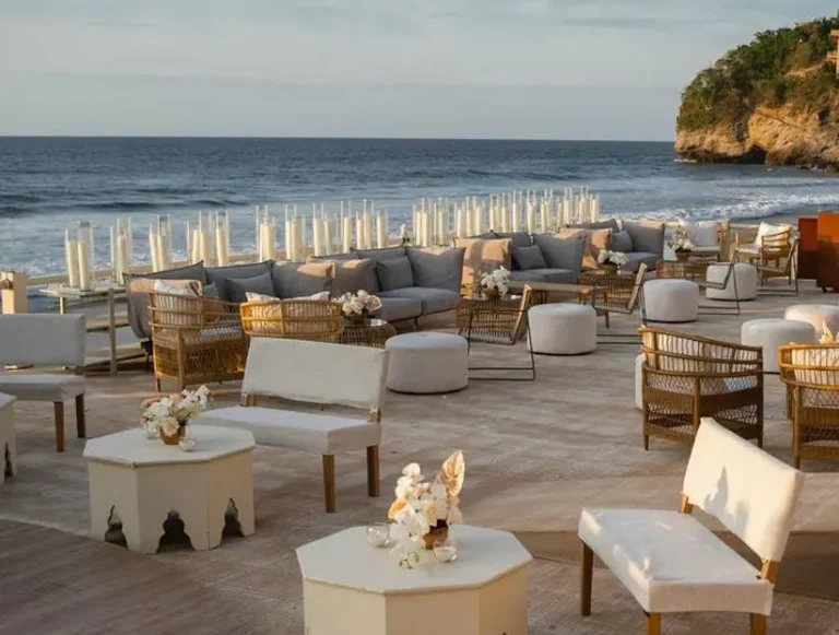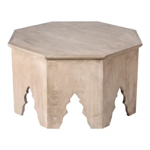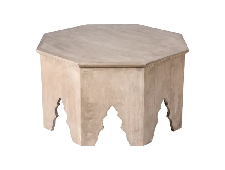 Mesa de centro estilo hindú en color marfil, con un diseño octagonal y detalles recortados en los laterales que evocan la arquitectura tradicional india. Ideal para renta en eventos que buscan una decoración exótica y elegante, esta pieza añade un toque cultural distintivo a áreas de lounge o estaciones de bienvenida, complementando ambientes con estilo bohemio o étnico sofisticado.