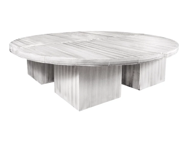 Esta es una mesa baja de diseño redondo en tono marfil, ideal para añadir un toque de elegancia y modernidad a cualquier espacio. La superficie muestra un sutil patrón de líneas que le aporta textura y un aspecto sofisticado, mientras que sus cuatro bases rectangulares le brindan solidez y un estilo único. Perfecta para áreas de descanso en eventos, esta mesa combina funcionalidad con un diseño contemporáneo que se adapta bien a decoraciones minimalistas y de lujo.