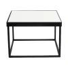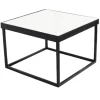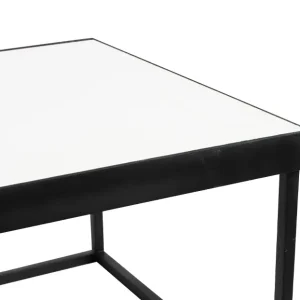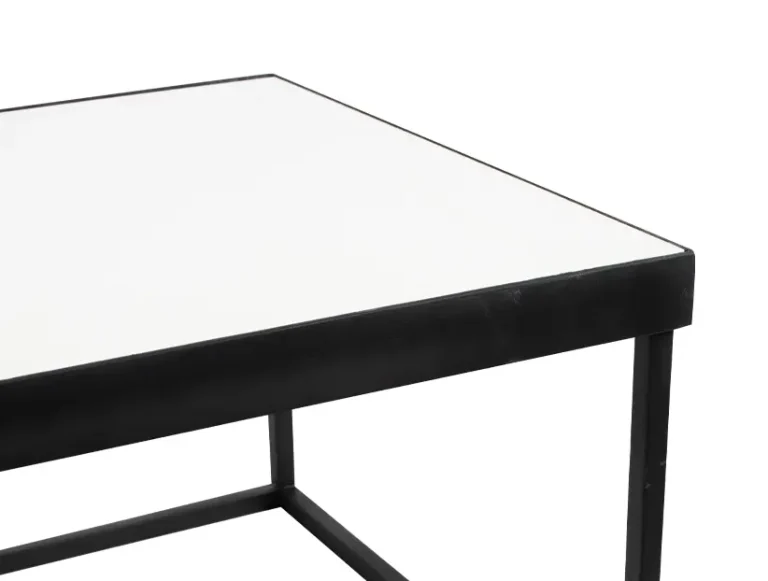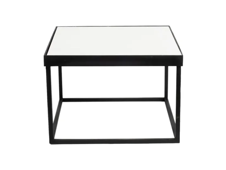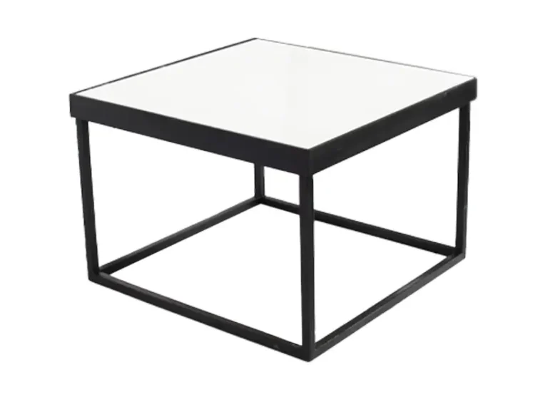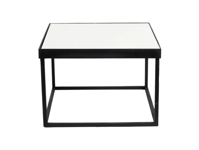Esta es una mesa cuadrada de diseño moderno y minimalista. Tiene un marco metálico negro que forma una estructura geométrica limpia y ligera. La superficie superior es plana y está cubierta con un acabado blanco brillante o mate, lo que crea un contraste elegante con el marco oscuro. Su estilo versátil la hace adecuada para eventos modernos, decoraciones minimalistas o espacios que requieran un toque contemporáneo. Es funcional como mesa de centro o mesa auxiliar.