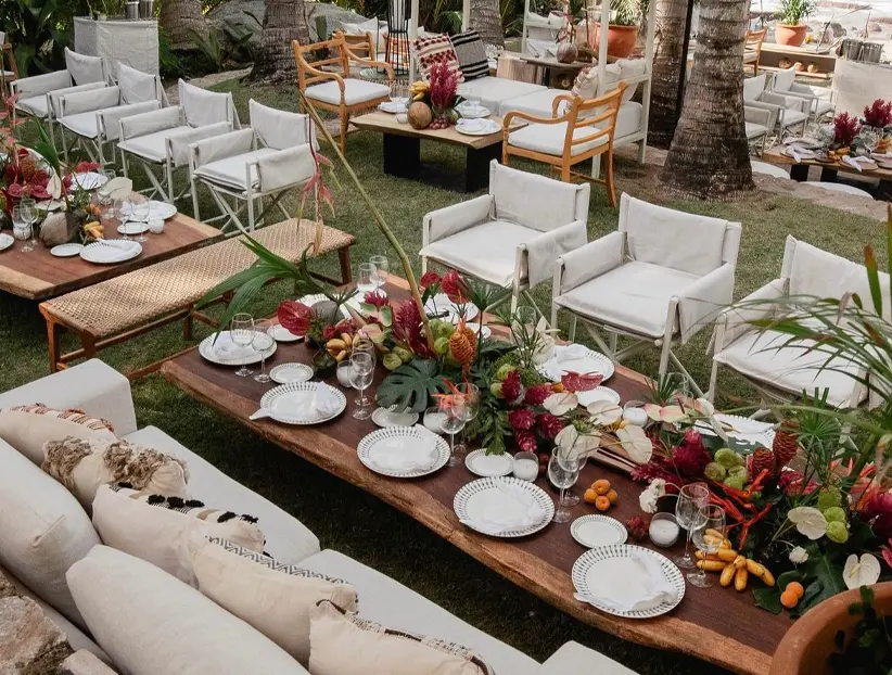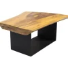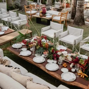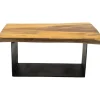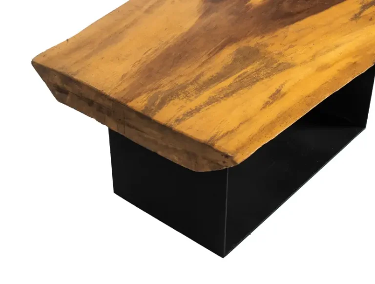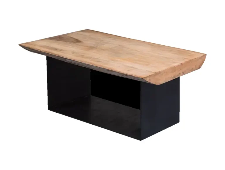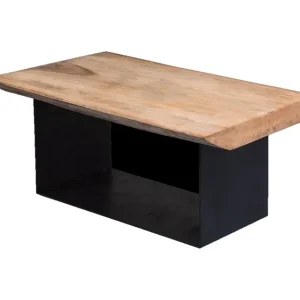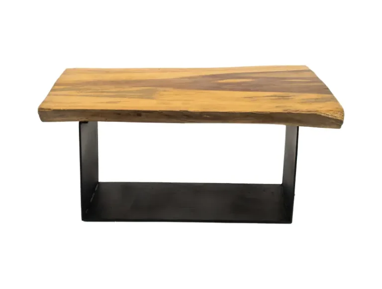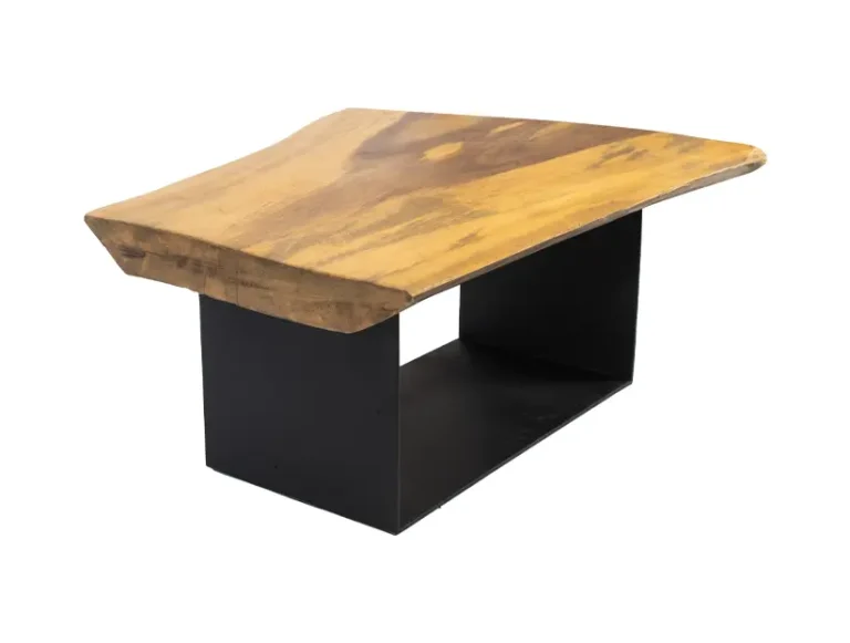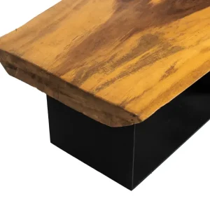 Mesa de centro moderna para renta en eventos, con un tablero de madera de parota natural que destaca por sus vetas cálidas y un diseño rústico, combinado con una base de metal negro en forma rectangular para un toque industrial y contemporáneo. Ideal para añadir un elemento de sofisticación y estilo natural en áreas de recepción, lounges o eventos con decoración moderna o estilo loft.