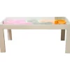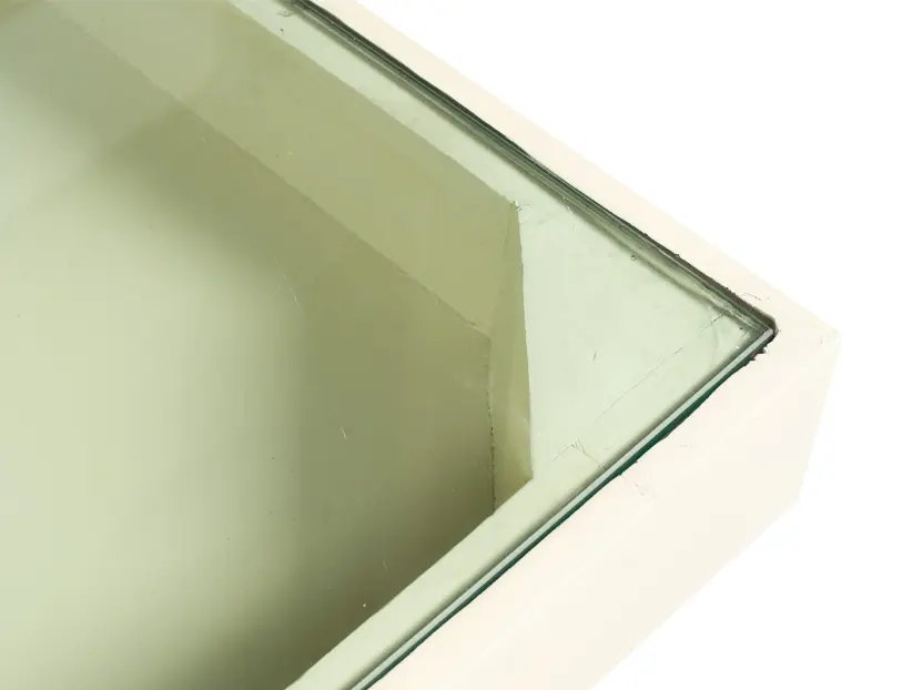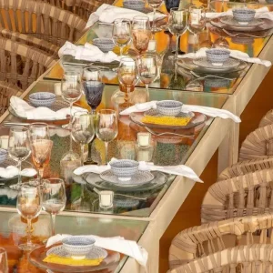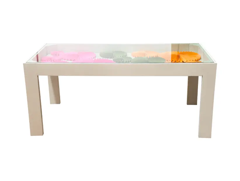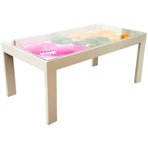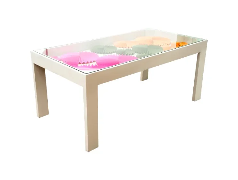 Esta mesa rectangular presenta un diseño único con doble fondo y una cubierta de vidrio, permitiendo exhibir decoraciones u objetos en su interior. Su estructura en tono claro aporta un aspecto moderno y limpio, mientras que el espacio bajo el vidrio añade versatilidad y creatividad para personalizarla según el evento o tema de decoración. Es ideal para celebraciones donde se busca un elemento interactivo y visualmente atractivo, ofreciendo una experiencia original y llamativa para los invitados.