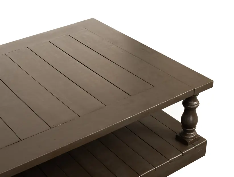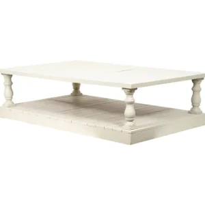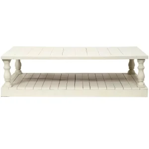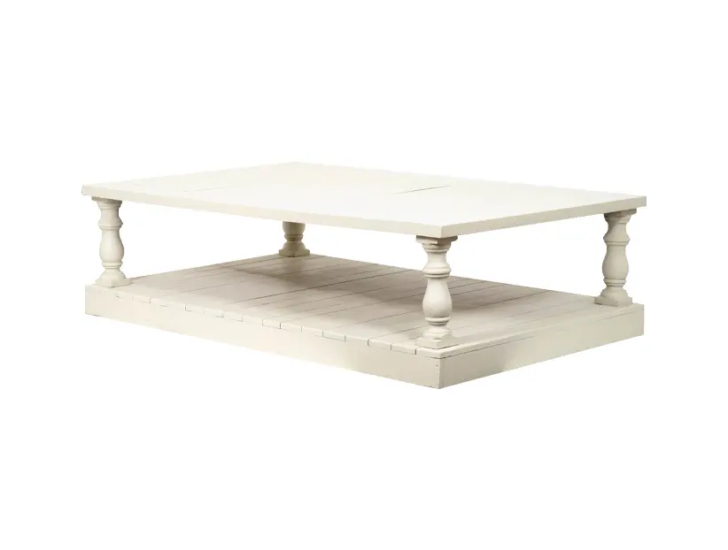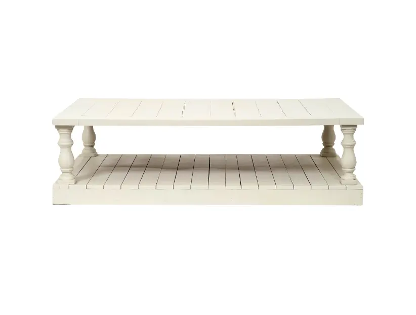 Esta mesa de centro en color ivory presenta un diseño clásico y elegante, con detalles de pilastras en las patas que le aportan un toque de sofisticación. Su estructura de dos niveles ofrece funcionalidad, permitiendo almacenamiento en la base inferior. El acabado en tono claro hace que esta mesa sea ideal para ambientes luminosos y decoraciones que buscan una estética refinada y acogedora. Es perfecta para complementar salas de estar o espacios formales, aportando un elemento decorativo y práctico a la vez.