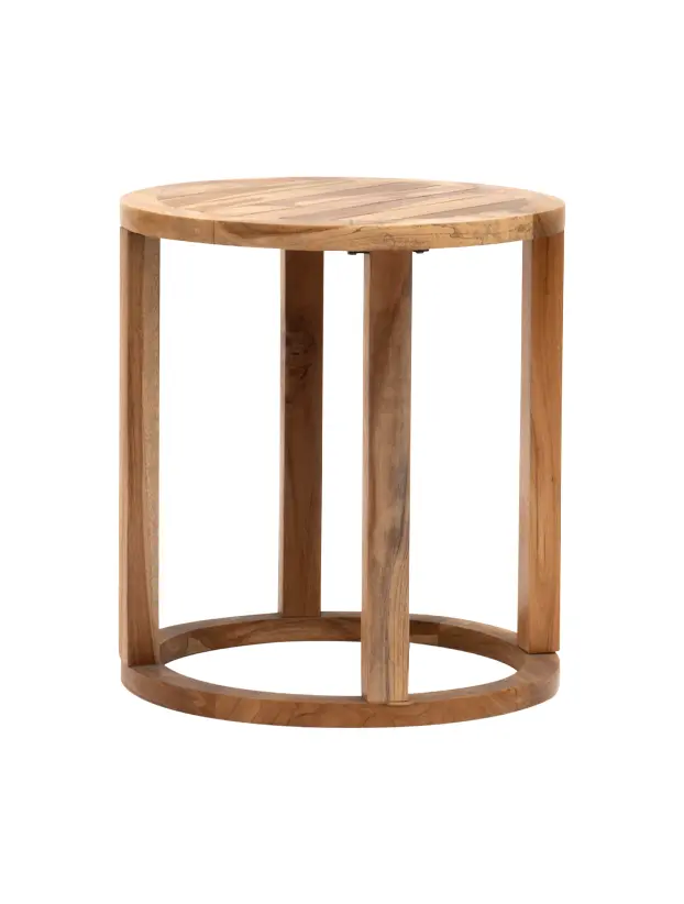 Mesa de acompañamiento de madera con diseño cilíndrico y estructura abierta, ideal para renta en eventos que buscan un toque cálido y natural. Su acabado en madera y su estilo sencillo y funcional la convierten en una pieza versátil, perfecta para áreas de lounge o como complemento en decoraciones rústicas o contemporáneas. Es una opción elegante y sobria para añadir textura y calidez a cualquier espacio.