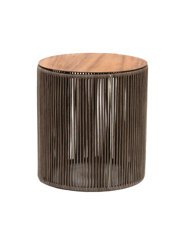 Este es un banco o mesa auxiliar de diseño moderno y elegante. Tiene una forma cilíndrica, con una base estructurada a partir de cuerdas o fibras tensadas en color marrón oscuro, que le otorgan un aspecto liviano y contemporáneo. La parte superior está hecha de madera con un acabado natural que contrasta de manera atractiva con la base. Este mueble es perfecto para eventos sofisticados o para complementar decoraciones bohemias, rústicas o modernas. Puede ser utilizado como asiento adicional o mesa auxiliar.