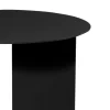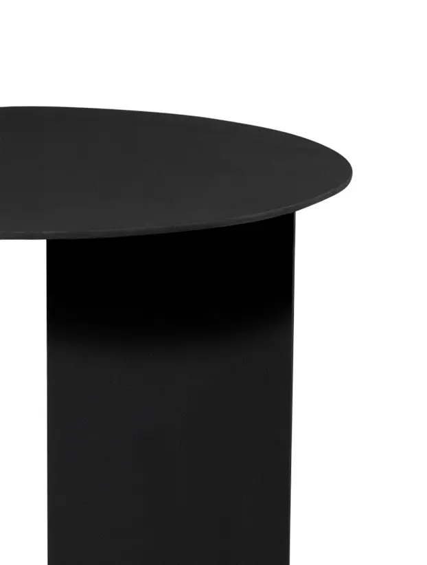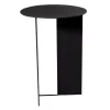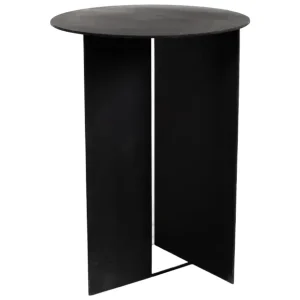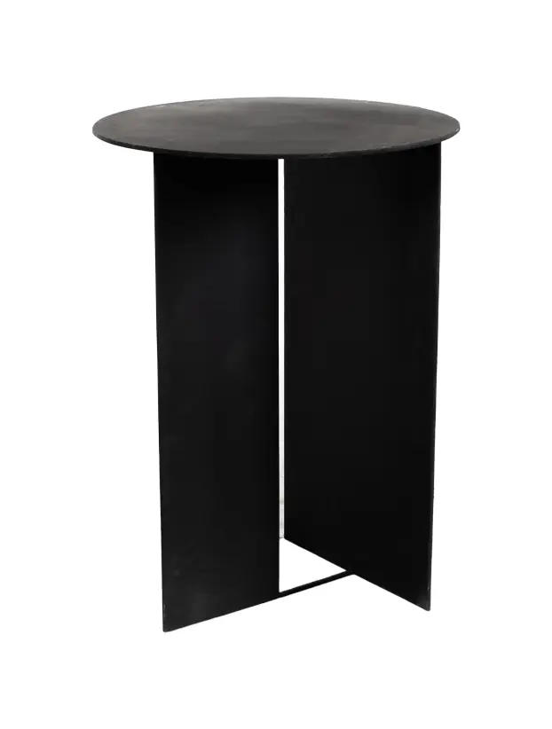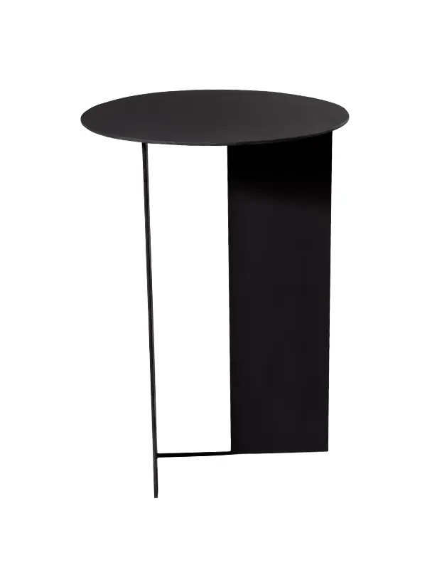 Mesa de acompañamiento negra con diseño minimalista, caracterizada por una base asimétrica que combina una estructura de metal en forma de panel con un soporte de barra. Su forma redonda y elegante la hace perfecta para renta en eventos modernos y contemporáneos, aportando un toque de sofisticación y estilo a áreas de lounge o espacios de reunión. Es ideal para complementar decoraciones sobrias y elegantes.