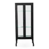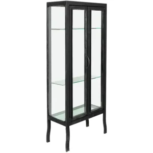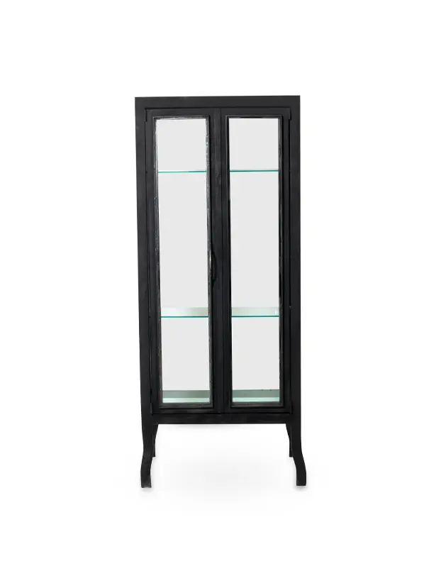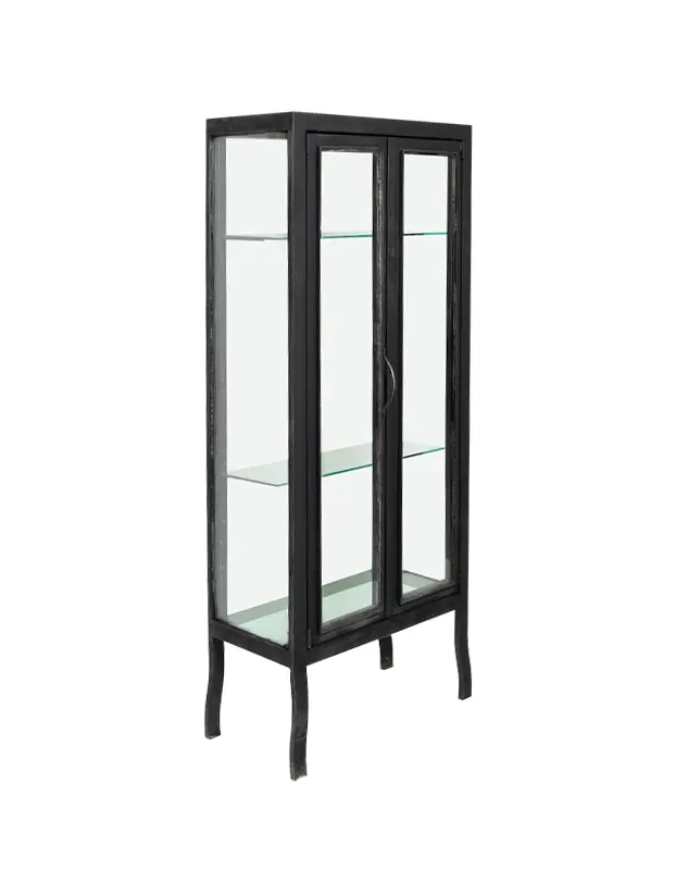 Este mueble de baño es una vitrina de estructura metálica negra con un diseño minimalista y elegante. Cuenta con dos puertas de vidrio en la parte frontal y estantes de vidrio en el interior, ideales para exhibir artículos de forma organizada. Su estilo industrial, combinado con la transparencia de sus estantes, hace que sea perfecto para agregar un toque moderno a cualquier ambiente, permitiendo que los objetos expuestos se conviertan en protagonistas. Es adecuado tanto para eventos como para espacios de baño que buscan un estilo decorativo funcional y estético.